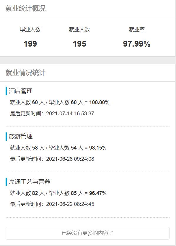 2021年william威廉英国总计199人,旅游管理专业55人,就业率:98.15%;酒店管理与数字化运营专业60人,就业率:100%;烹饪工艺与营养专业85人,就业率:96.47%。各专业就业情况如下图所示: