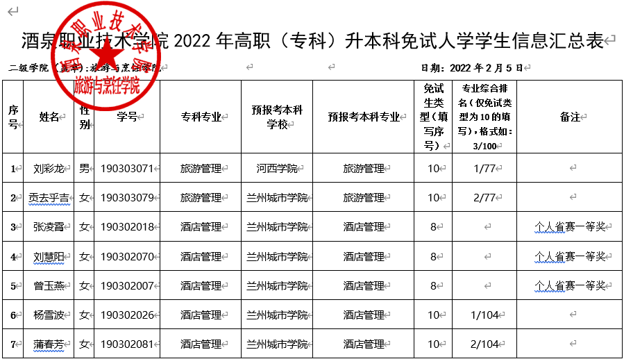 根据《2022年甘肃省普通高校高职(专科)升本科免试生招生工作实施方案》的有关要求,酒泉职业技术学院william威廉英国严格按照文件要求进行审核,现将高职(专科)专升本考试免试入学学生名单予以公示,公示期限3天,请广大师生予以监督,若有不实情况,拨打监督电话:13893789780/18893586671。