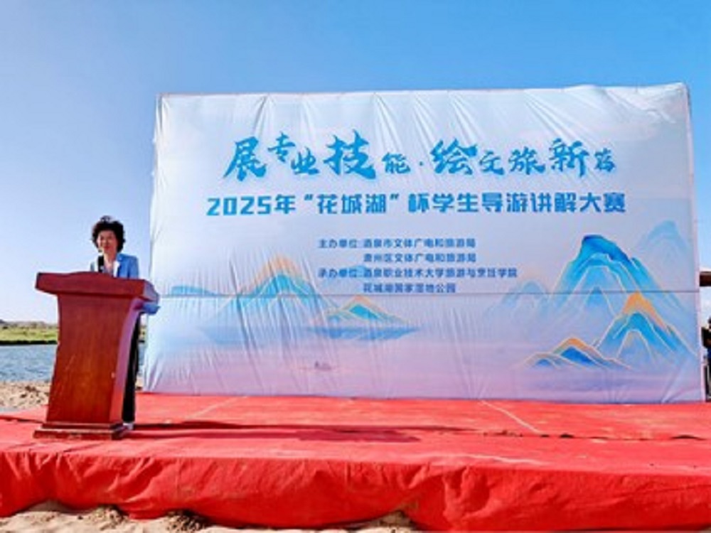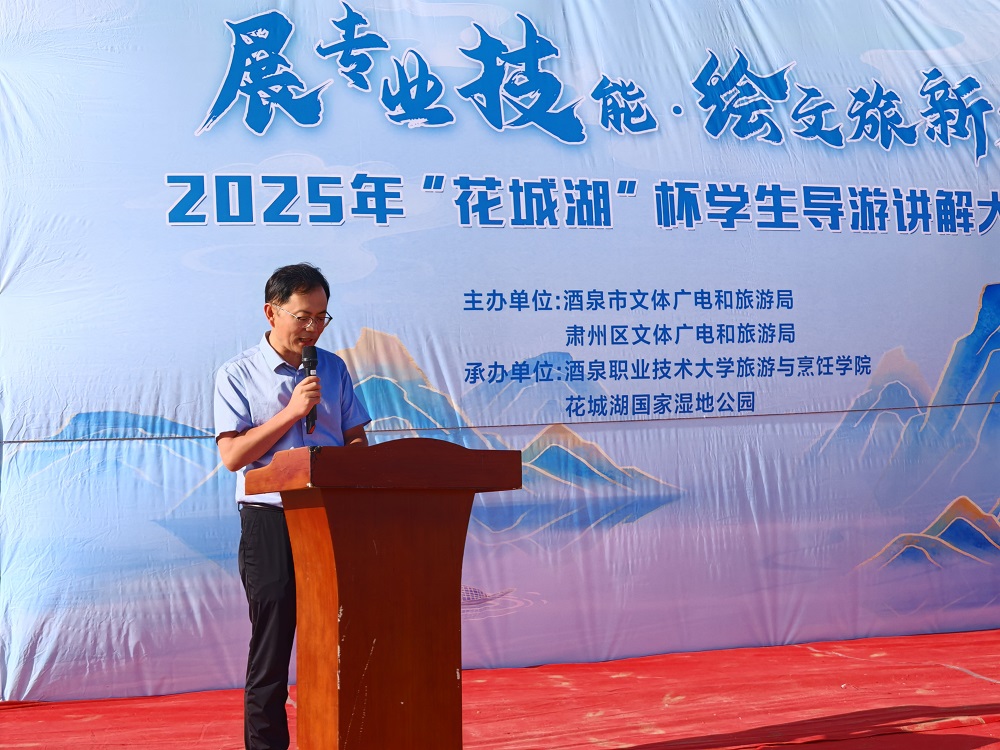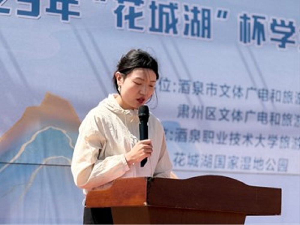 开幕式上,酒泉市文体广电和旅游局副局长周明在致辞中指出,酒泉作为古丝绸之路重镇,文旅产业发展潜力巨大,希望通过赛事搭建校企合作平台,培养兼具文化底蕴与实践能力的复合型文旅人才。随后,花城湖景区总经理赵秀琴致辞,结合景区特色,鼓励选手以生动讲解传递酒泉文旅魅力。